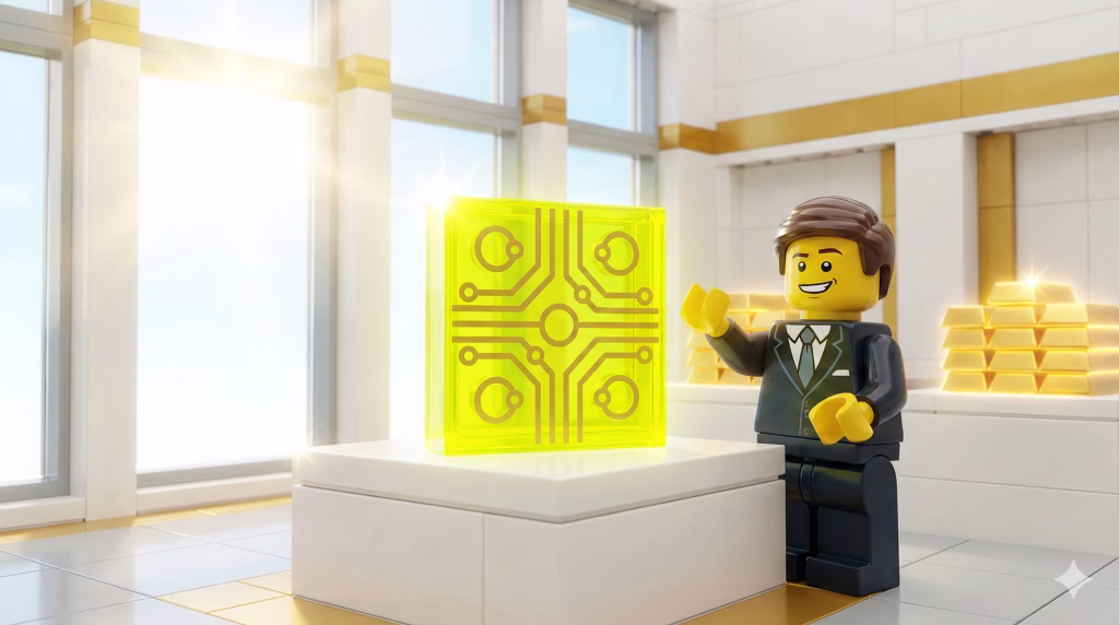 Ein Lego-Miner hält die Zukunft in der Hand: Einen makellosen, leuchtenden Krypto-Coin. Umgeben von schwerem Gerät und staunenden Minifiguren symbolisiert dieses Bild den perfekten Mix aus harter Arbeit und digitaler Revolution im Klemmbaustein-Universum.